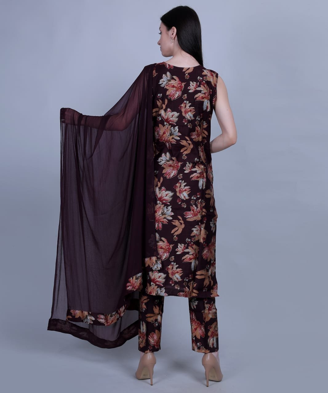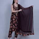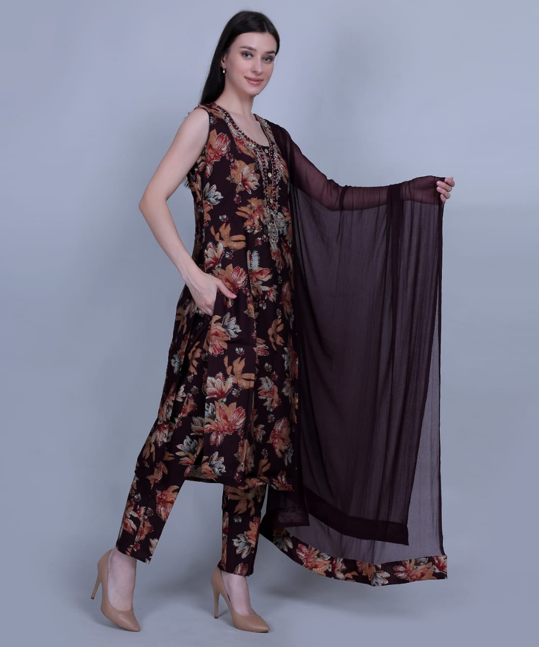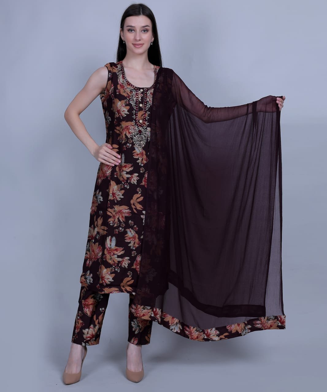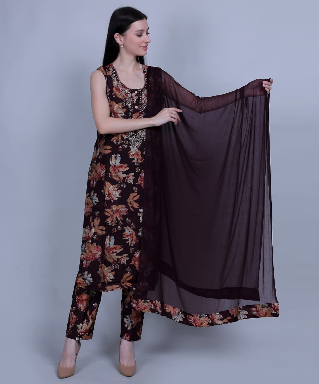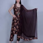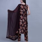 Elevate your ethnic wardrobe with this rich maroon 3-piece suit set, crafted from breathable muslin fabric. The A-line kurta is adorned with intricate floral patterns and subtle sequin detailing. Paired with solid straight pants and a lightweight chiffon dupatta, this set blends tradition and style effortlessly.